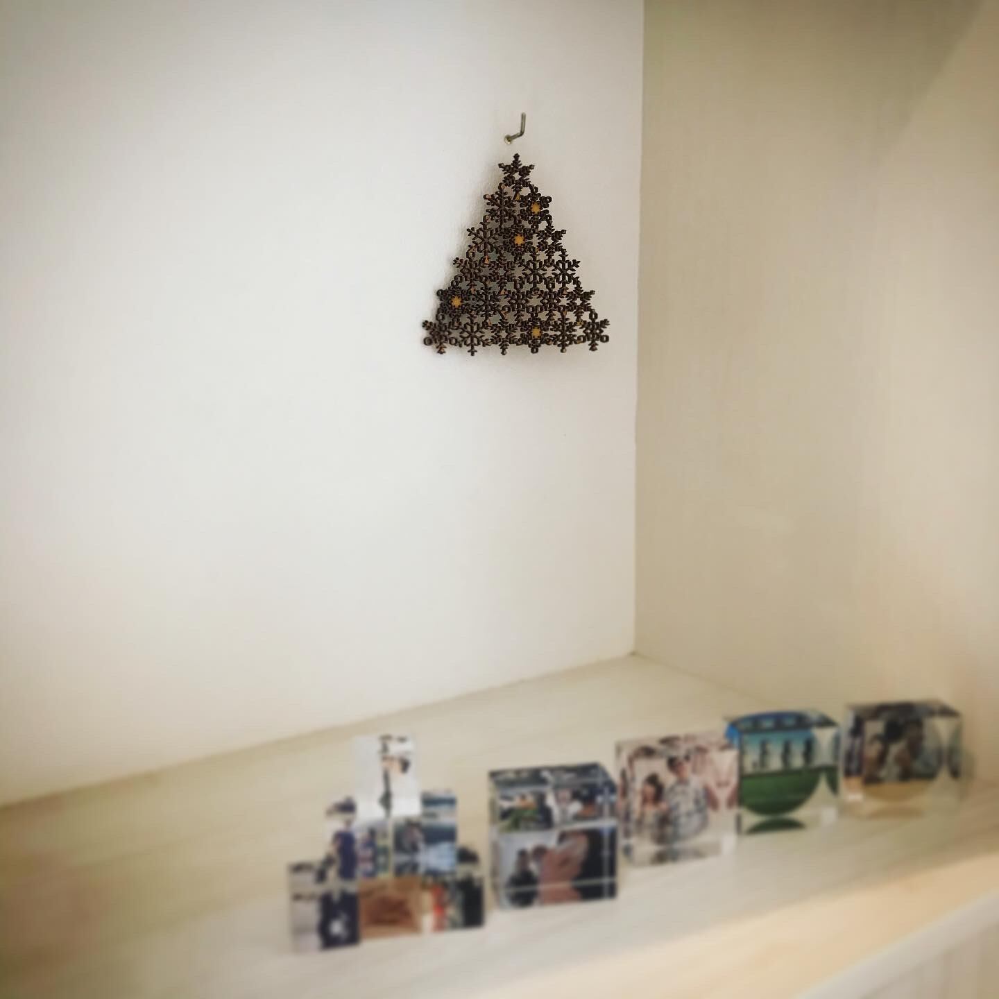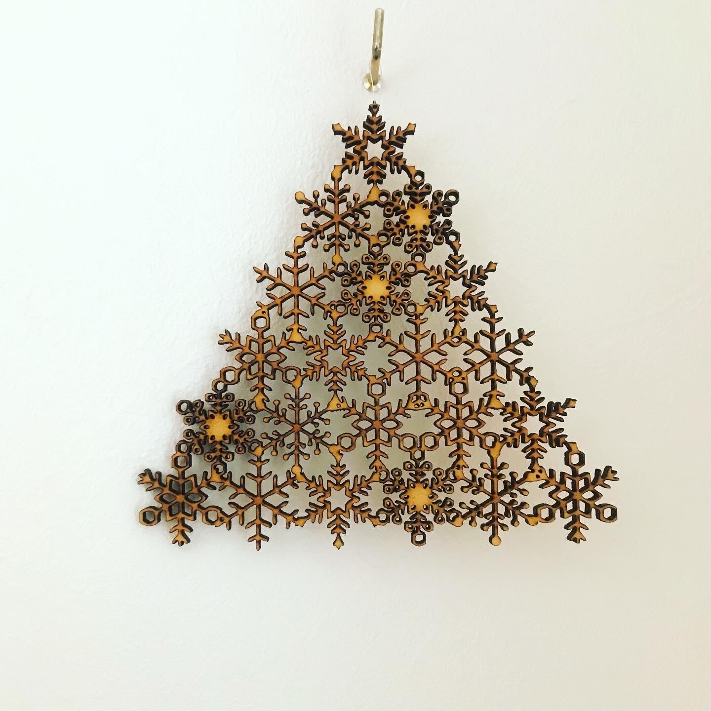1辺が約15センチの三角形です。 雪の結晶を並べてデザインしました。